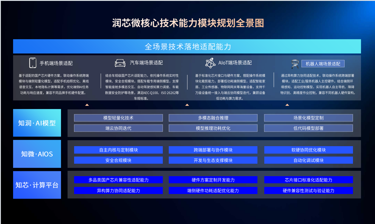 会上,企业完整阐释“1+4+N”战略布局,并对“知芯+知微+知润”三大技术基座进行系统性解读,形成统一、可扩展的全栈技术体系,以标准化底层抽象能力,实现硬件与系统、技术与场景的高效衔接。